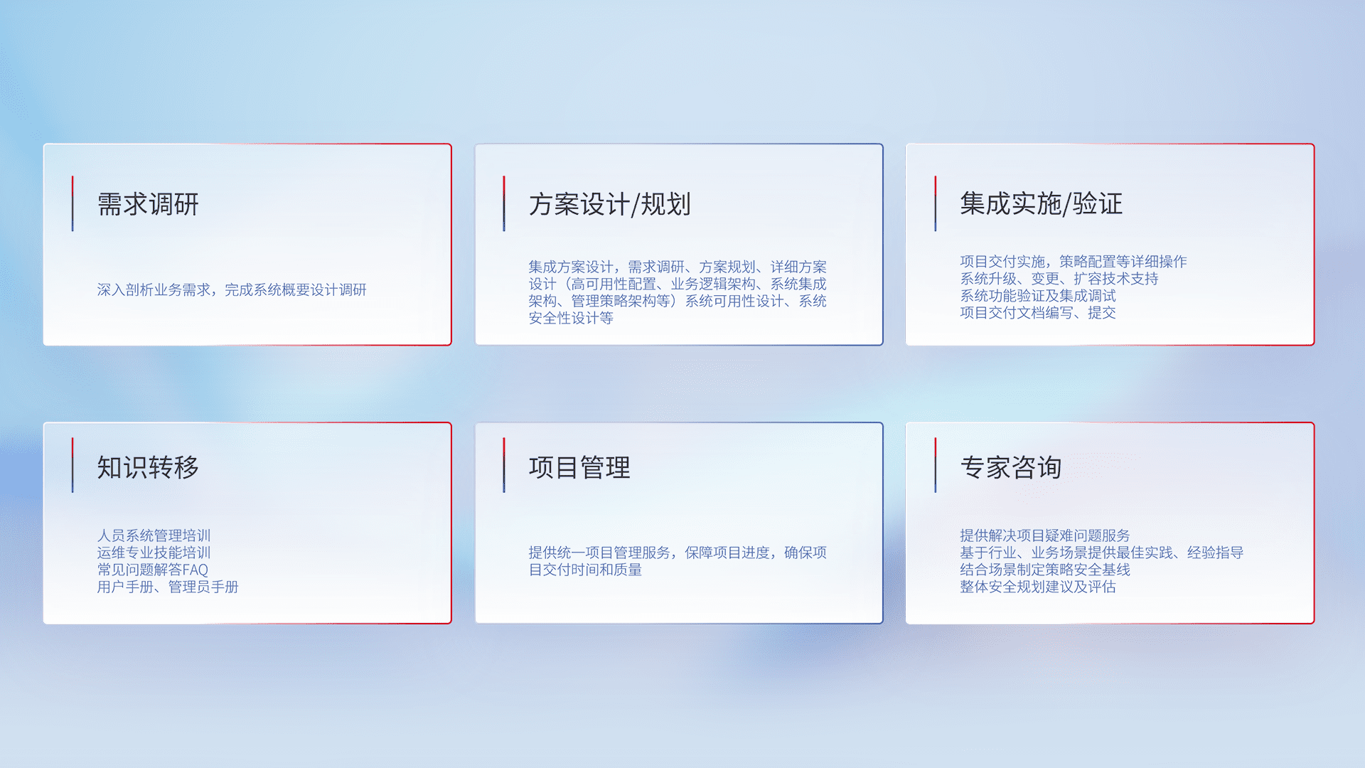 针对客户行业特性,,,,将宏观的安全战略和需求,,通过专业的交付服务,,实现项目落地,,,为客户提供标准规范的集成交付服务。。。